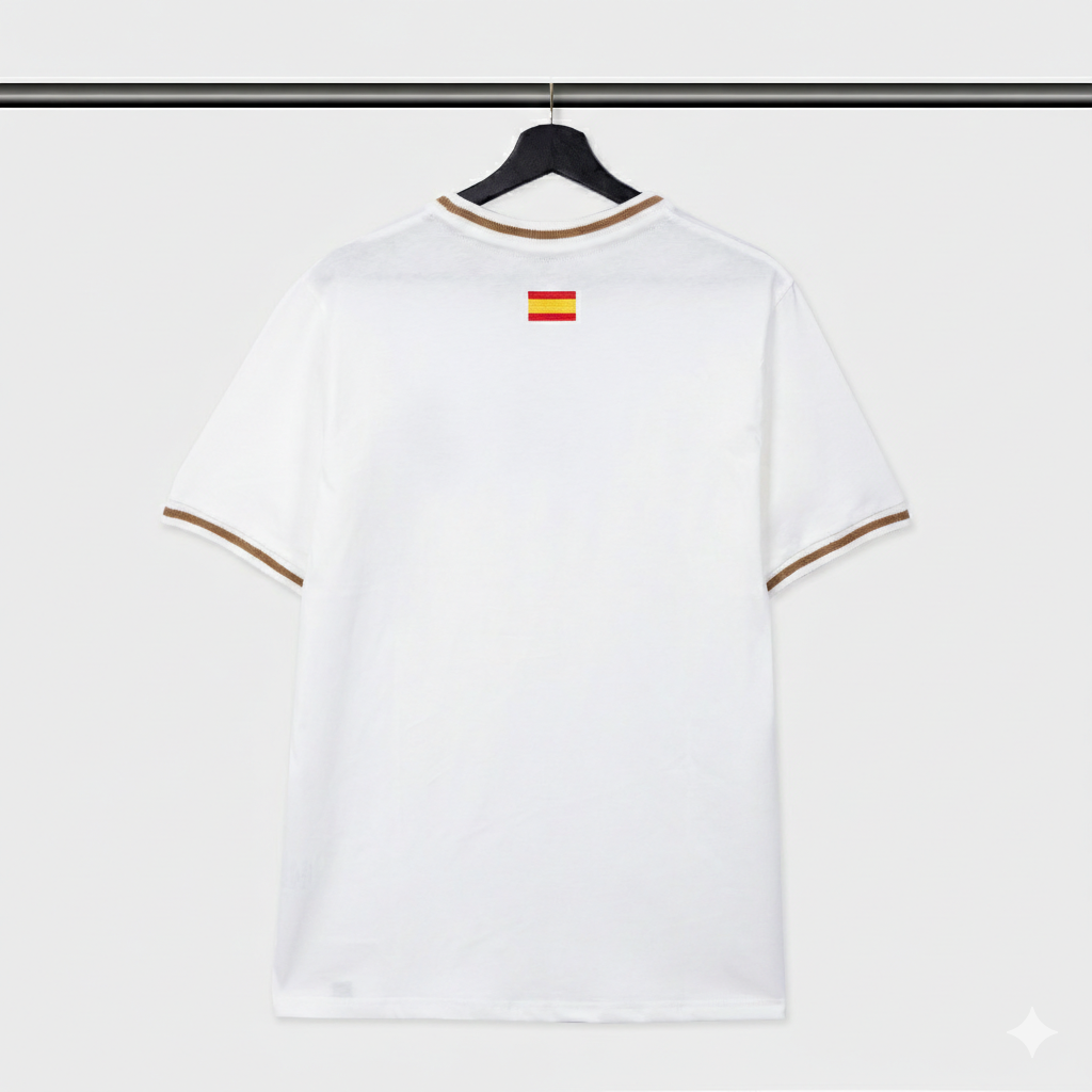 This fine cotton white shirt, inspired by "Los Merengues," features a luxurious, minimalist design with a shimmering golden logo embroidered over the heart, symbolizing the club's legacy of excellence and countless victories. Crafted as a tribute to the club's iconic all-white kit, this shirt is a timeless piece that embodies the elegance, pride, and it's unwavering spirit.